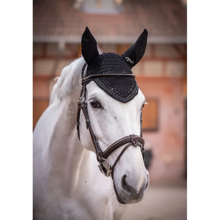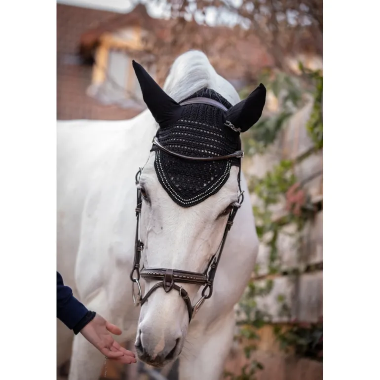 Le bonnet pour chevaux New Strass est un véritable petit bijou à assortir avec le tapis du même nom. Avec sa jolie coupe en V, il se pose harmonieusement sur le chanfrein. Ses oreilles en stretch permettent de s’adapter à de nombreuses tailles. Côté look, un rang de strass est cousu le long du V sur le chanfrein et on retrouve le logo Pénélope également en strass sur l’oreille gauche.