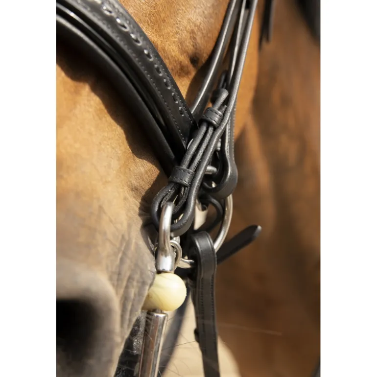 La large muserolle pull back est entièrement doublée de cuir. Sous la boucle, elle est dotée d’une protection en cuir pour équilibrer la pression sur les mâchoires. Les boucles des montants de filet et de bride s’équipent d’élastiques, qui permettent de supporter légèrement le mors. Très apprécié par les chevaux sensibles qui n’aiment pas le contact du mors sur les barres.