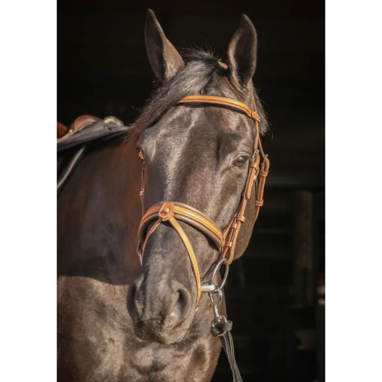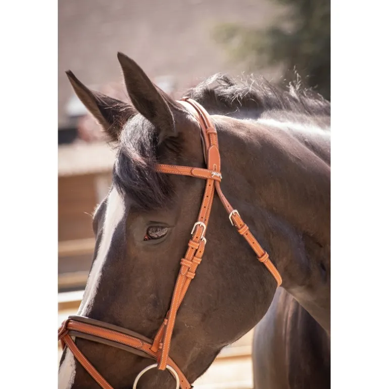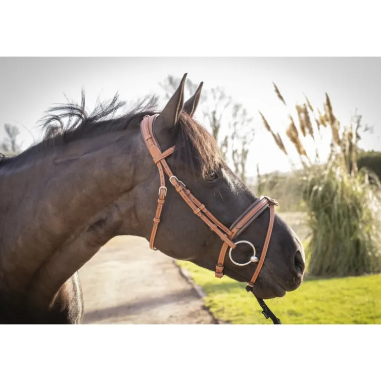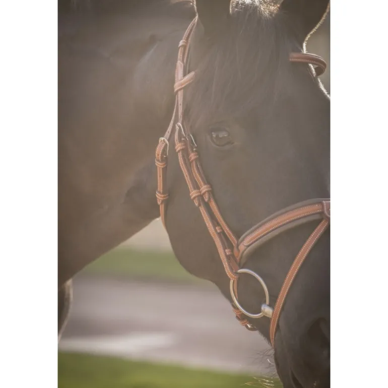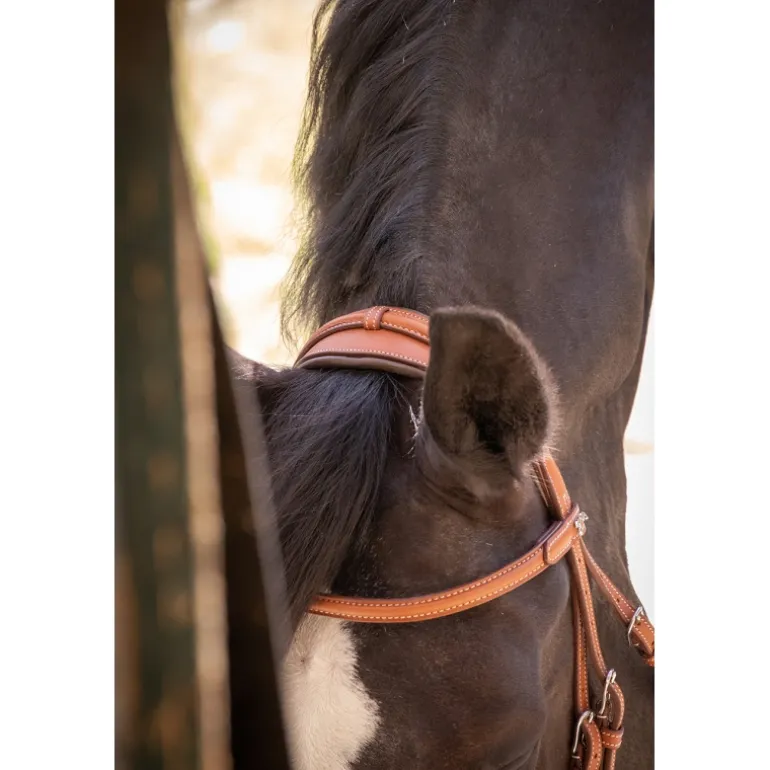 Bridon « Elégance » Pénélope orné de surpiqûres crèmes en contraste. Il est composé d’une muserolle large combinée doublée de cuir souple et d’une têtière anatomique elle aussi doublée de cuir souple sur la zone en contact avec la tête du cheval. Sur le dessus de la têtière se trouve un insert fin décoratif glissé dans des passants en cuir. Le pin’s Pénélope argenté est fixé à gauche sur le passant du frontal.