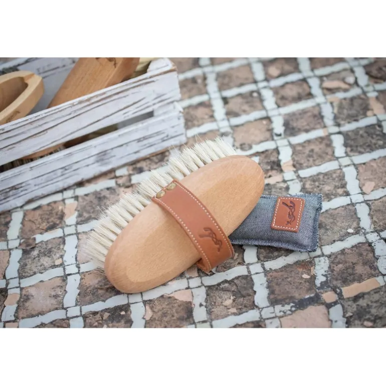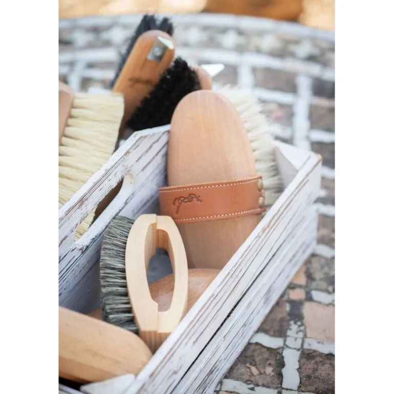 Une très belle brosse qui va donner un maximum de style à votre sac de pansage. Cette brosse douce Pénélope est dotée d’une poignée en cuir pour une bonne prise en main et pour un pansage précis ! Ses poils très doux permettent de brosser les zones les plus sensibles de votre cheval. On retrouve le logo Pénélope embossé sur la poignée en cuir.