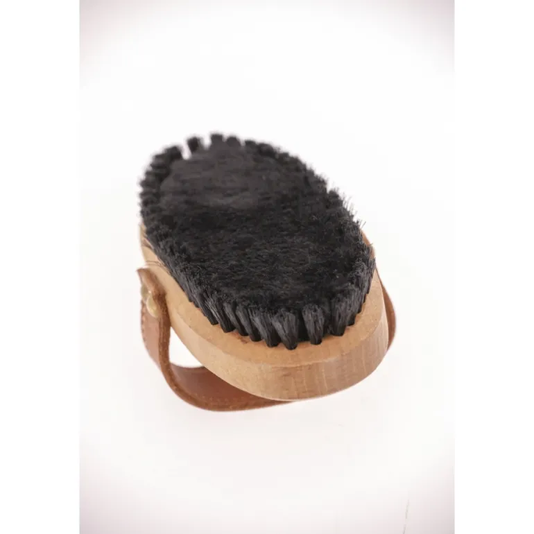 Brosse extra-douce composée de deux types de poils pour un brossage précis, doux et soigné. Sa forme ovale et sa poignée en cuir la rendent particulièrement pratique et assurent une bonne prise en main. Sur le dessous, au centre, des poils ultradoux permettent un brossage très soft. Tout autour, des poils courts et drus permettent de désincruster la saleté et assurent un bon pansage.