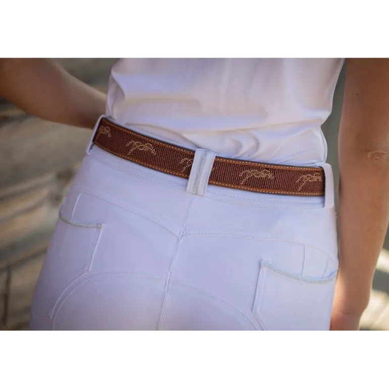 Une variation sur le thème des perles qui avaient déjà eu un franc succès avec notre modèle Pearl (disponible ICI). Cette fois-ci la ceinture Pearlog propose une frise de logos Pénélope dans les tons de marron et de caramel, légèrement brillants. Le reste de la ceinture est composé d’un joli cuir très féminin. Notre ceinture Pearlog se porte aussi bien sur un pantalon d’équitation que sur un jean, aussi bien aux écuries qu’en ville.