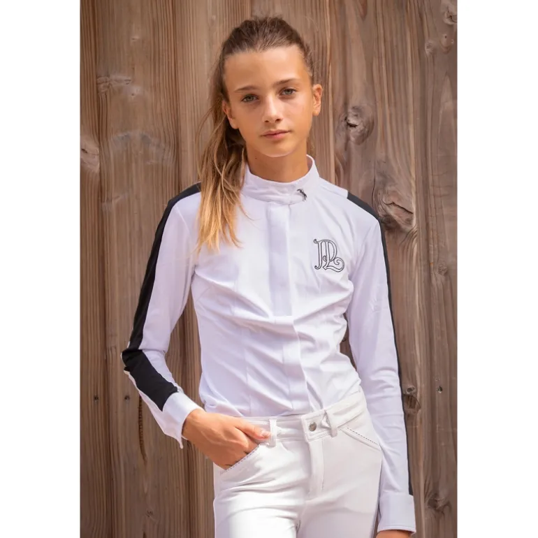 Un modèle de chemise de concours à manches longues qui va se fondre sous votre veste de concours ou tout simplement sur vous ! Son tissu si doux et ultra-stretch se porte près du corps et se rentre parfaitement dans votre pantalon de concours pour un cintrage parfait. La chemise Showshirt se ferme par une rangée de boutons cachés par une jolie patte. Sur les épaules et le long des bras, on trouve une bande noire en contraste réalisée dans un tissu micro-aéré qui rendra cette chemise très respirante et agréable à porter. Dans le dos, deux fines bandes de tissu noir (différent de celui présent sur les bras) apportent un look original et dessinent joliment la ligne de dos. Son col officier est légèrement moins montant que d’habitude et toujours réhaussé d’une petite breloque argentée du logo Pénélope.