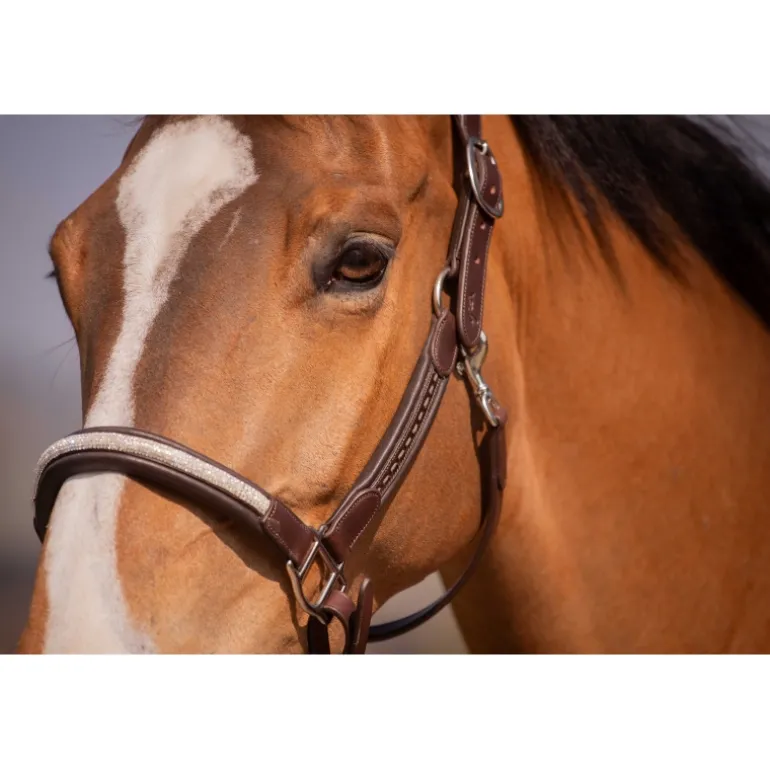 Comme un bijou, ce superbe licol en cuir est orné de strass sur la muserolle et surmonté d’un beau verni point sellier sur la têtière et les montants.