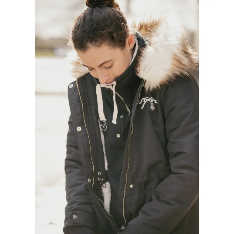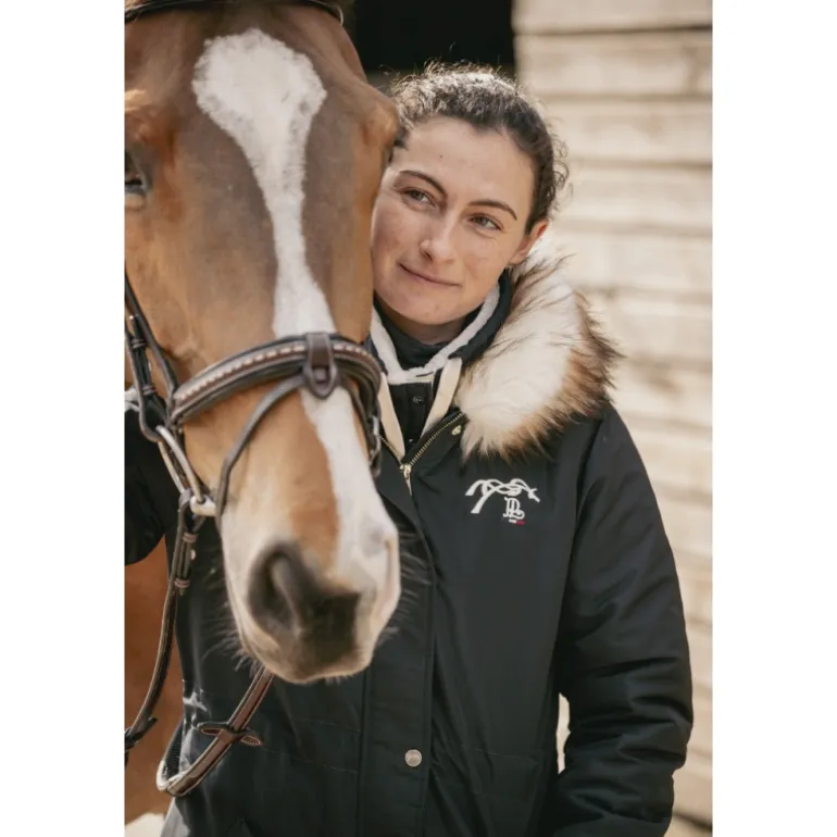 Parka Pénélope « Mega Lyon » créée sur la base du mythique bombers Lyon de la marque mais disponible ici dans une version mi-longue. Dotée d’un grand zip sur le devant avec un rabat à pressions, il est doublé d’une belle épaisseur de polaire ultra-douce et sa capuche est entourée d’une très belle fausse fourrure. La parka Mega Lyon a un cordon de serrage à la taille et deux poches en biais fermées avec des pressions de chaque côté. Légèrement plus long, à l’arrière, elle est dotée d’une fente pour plus de confort. Elle est idéal à porter aux écuries à pied, mais aussi en ville durant la saison froide.