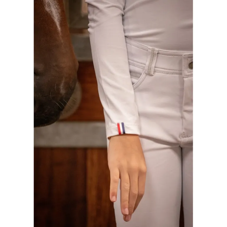 Le polo de concours pour les mini-Pénélope, aux petits airs frenchy qu’on adore! En lycra très extensible et confortable, il a une coupe cintrée près du corps et donne un effet seconde peau. Le bas de la manche droite et les épaules sont décorés d’un galon en bleu blanc rouge. Le col officier est fermé par quatre petites pressions discrètes.