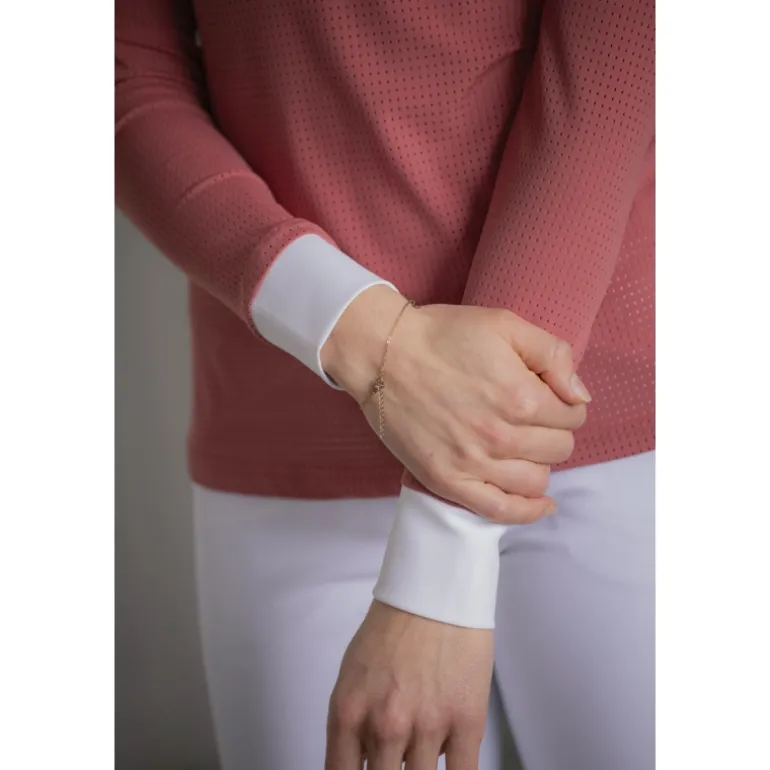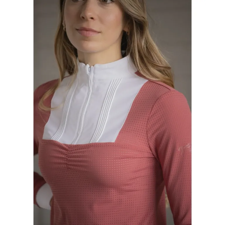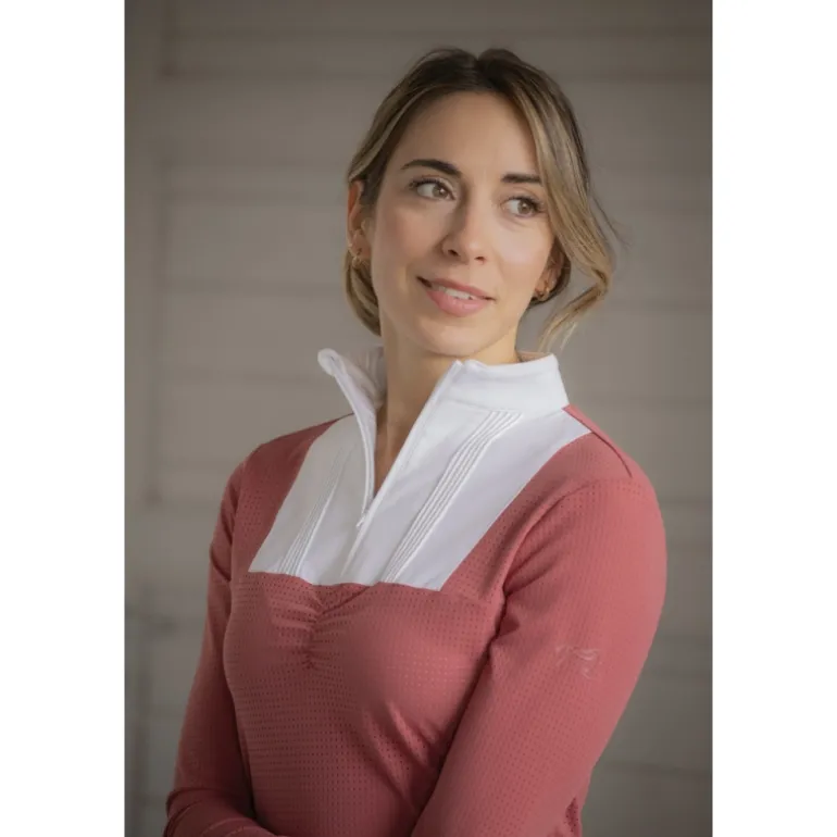 Le Polo de Concours Florence des collections Pénélope à manches longues est confectionné dans un joli tissu micro aéré. Il a un col officier avec un petit zip caché, un plastron blanc strié et une jolie fronce sur le devant. Le bout des manches est blanc et le coloris terracotta de ce polo lui confère un look féminin et très élégant.