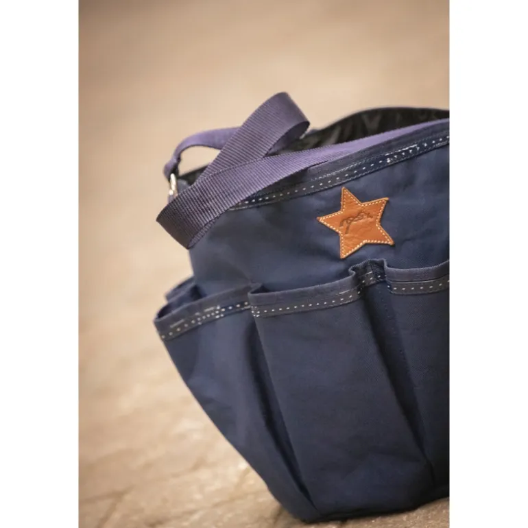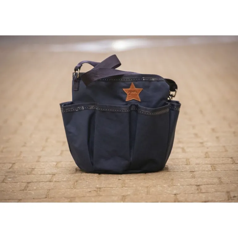 Sac de pansage « Grooming » Pénélope. Composé d’une grande poche centrale et de 8 petites poches autour, il est idéal pour ranger tous les produits de pansage (brosses, étrilles, peignes, pinceaux etc) ou de soin (spray, crème etc). Il est confectionné dans un tissu type bâche ultra-résistant et il possède une anse facile à détacher grâce à un mousqueton argenté. Cette anse permet de transporter facilement le sac Grooming et de l’accrocher partout, aux écuries comme en concours.