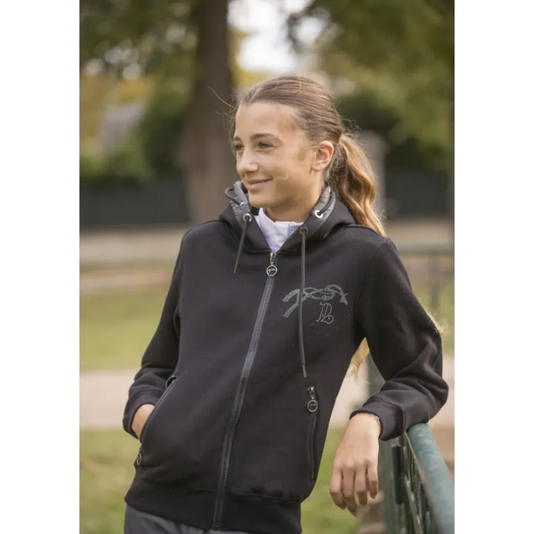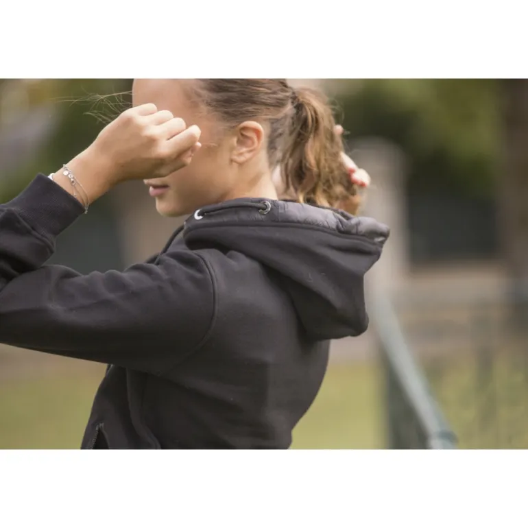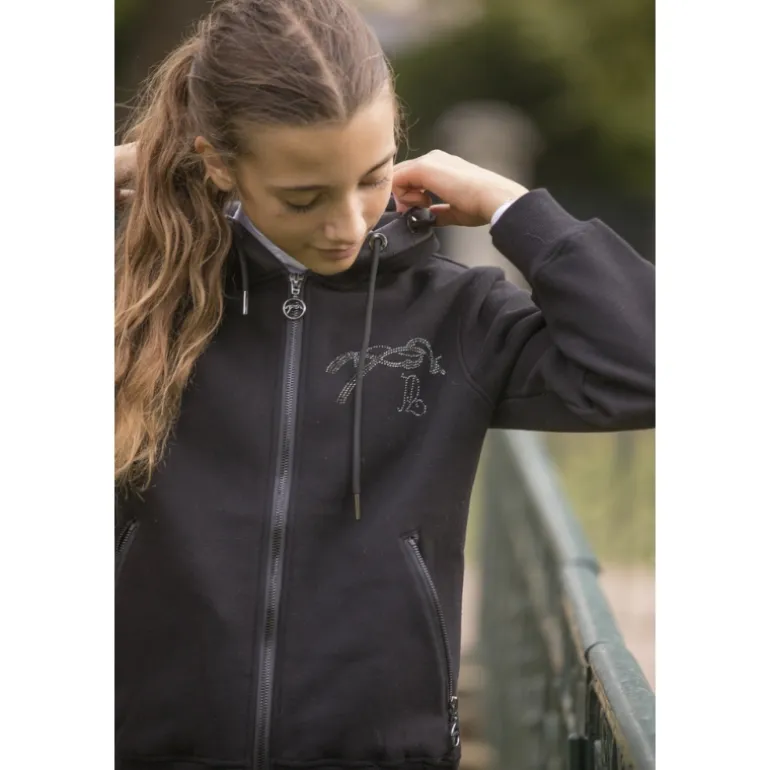 Sweat-shirt Fluore noir zippé sur le devant et orné du logo Pénélope en strass sur le cœur. Il est doté d’une capuche bi-matière de laquelle sort un cordon de serrage par deux œillets différents. Le sweat Fluore est doté de deux poches zippées à l’avant.
