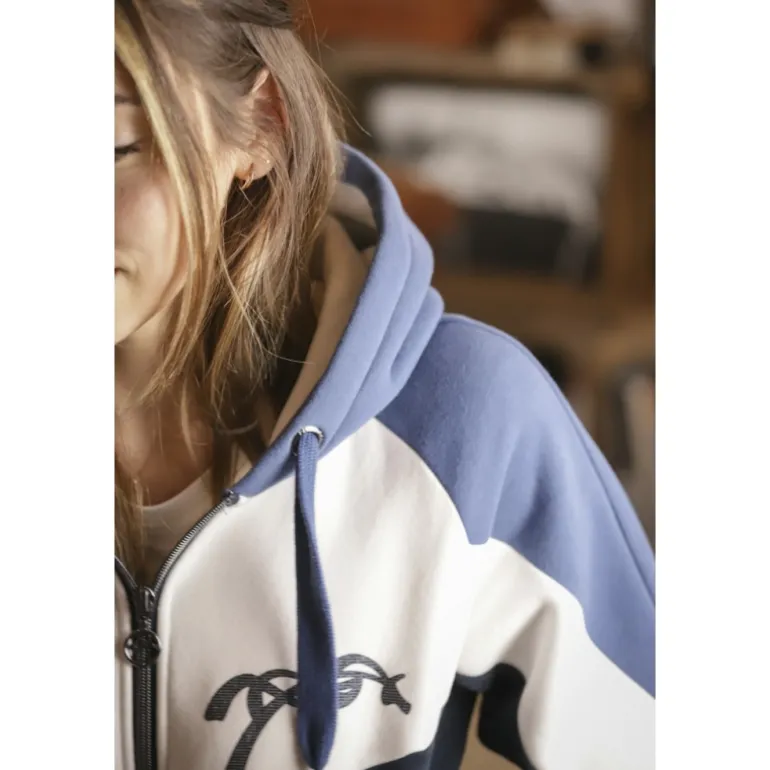 Le Sweat-shirt New Twister Pénélope est zippé et possède deux poches sur le devant qui se ferment par des pressions. Esprit « color block » car composé de trois couleurs : bleu lumière sur la capuche et le haut des épaules, blanc sur le haut du sweat et marine sur le reste du corps. Sur le cœur et à droite, le monogramme PL et le logo Pénélope se répondent dans un joli glitter perforé marine.