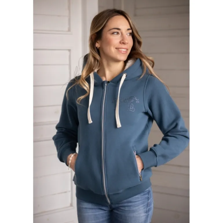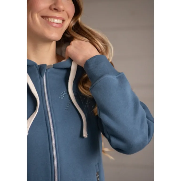Le Sweat-shirt Tressy marine des Collections Pénélope est bien épais et zippé sur le devant. Il est doté d’une grande capuche doublée d’une polaire ultra douce de laquelle sortent deux cordons beiges pour un ajustage facile. Il possède deux poches sur le devant qui se ferment avec un zip. Sur le cœur, le logo Pénélope en strass complète le look de ce sweat très girly.