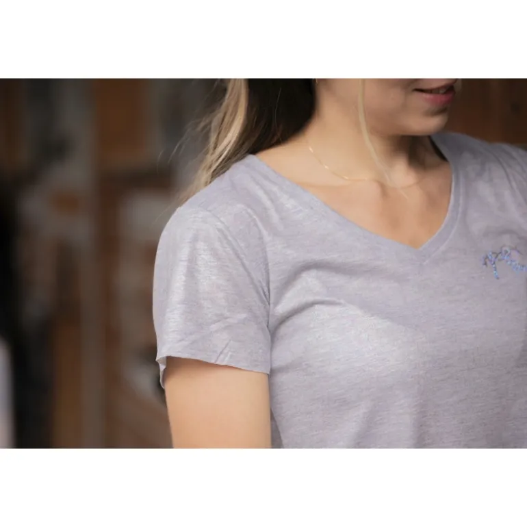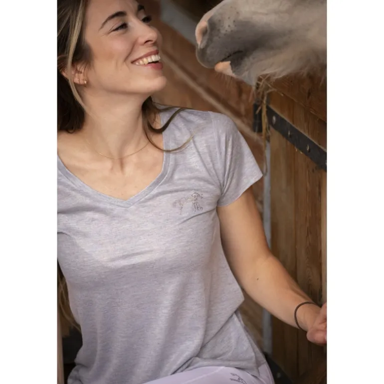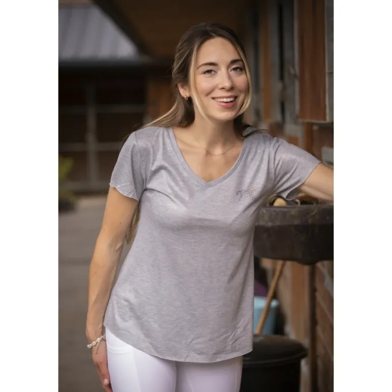 À manches courtes avec un joli col V, le t-shirt Pénélope Juline est confectionné dans un tissu grisé légèrement irisé. Le logo Pénélope apparaît discrètement sur le cœur en strass. Basique et très léger à porter, il convient aussi bien pour la vie aux écuries qu’à la ville.