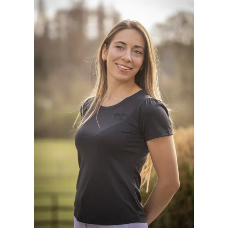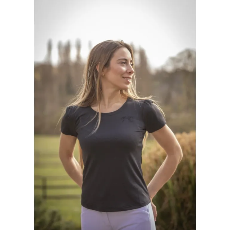 Le t-shirt Techty Honey est confectionné dans un tissu technique micro-aéré respirant. Ultraléger et légèrement gaufré, il est original et sobre à la fois et spécifiquement étudié pour la pratique du sport équestre ou d’autres sports. Il possède des manches courtes rehaussées de petites fronces et un marquage du logo en strass sur le cœur.
