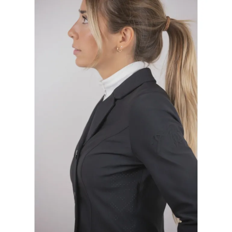 Confectionnée dans une matière ultra stretch, une partie de la veste est ajourée pour permettre un maximum de confort et de respiration. Elle est composée d’un zip sur le devant complété par un rabat sur lequel se ferment trois boutons ton sur ton. Sur le devant, il y a deux fausses poches surmontées d’un galon plat légèrement brillant. Elle est particulièrement cintrée et féminine et s’ajuste à de nombreuses morphologie. Confortable, elle est parfaite pour participer à des compétitions équestres avec beaucoup d’élégance.