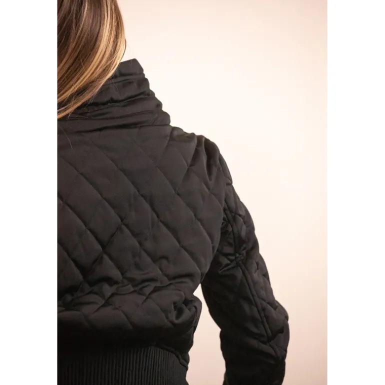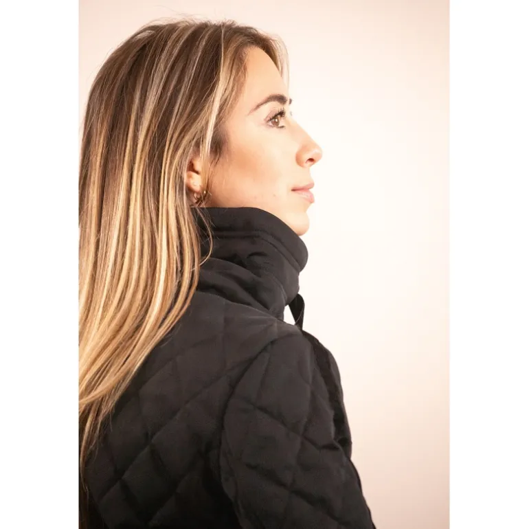 Blouson matelassé Luka Pénélope avec un col montant. Il est confectionné dans un tissu au toucher « Soft », matelassé et très agréable à porter. A l’arrière, son bas du dos smocké lui offre une coupe cintrée et le féminise parfaitement. Une matière velours vient s’ajouter en petites touches. On la retrouve en fines bandes le long de chaque bras, sur les cordons de serrage du col, au niveau de la fermeture des poches et sur chaque côté du zip. Il se ferme grâce à un grand zip sur le devant et possède aussi deux poches mains qui se ferment par un bouton pression orné du monogramme « PL« . On distingue également le petit logo Pénélope brodé sur le cœur.