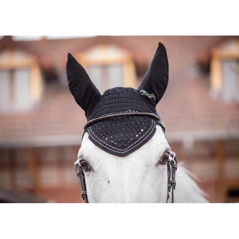Le bonnet pour chevaux New Strass est un véritable petit bijou à assortir avec le tapis du même nom. Avec sa jolie coupe en V, il se pose harmonieusement sur le chanfrein. Ses oreilles en stretch permettent de s’adapter à de nombreuses tailles. Côté look, un rang de strass est cousu le long du V sur le chanfrein et on retrouve le logo Pénélope également en strass sur l’oreille gauche.