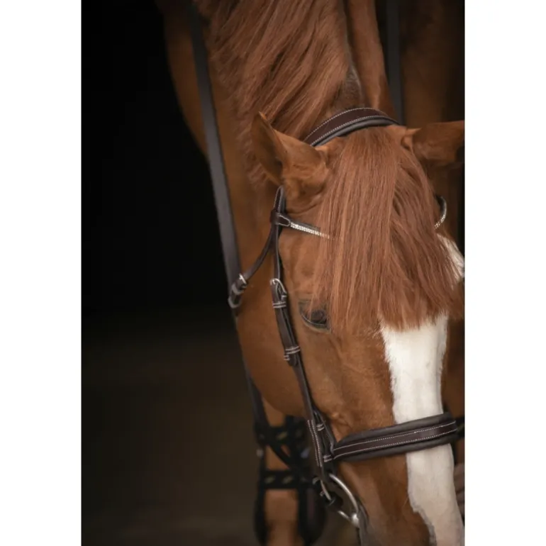 Grâce à son design chic et son frontal scintillant, ce bridon est parfaitement adapté pour les concours hippiques.