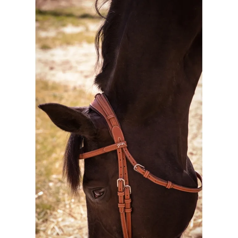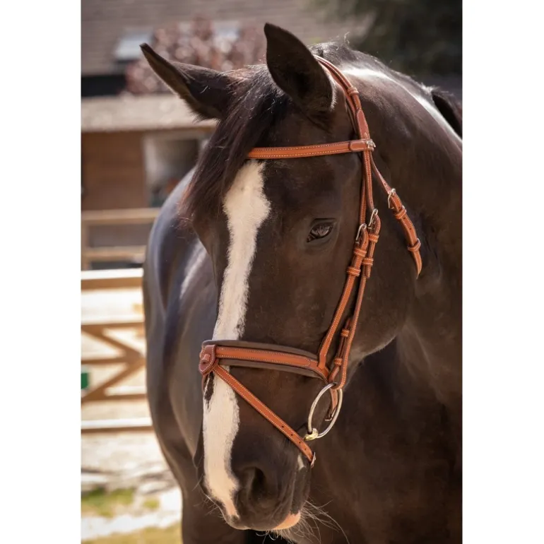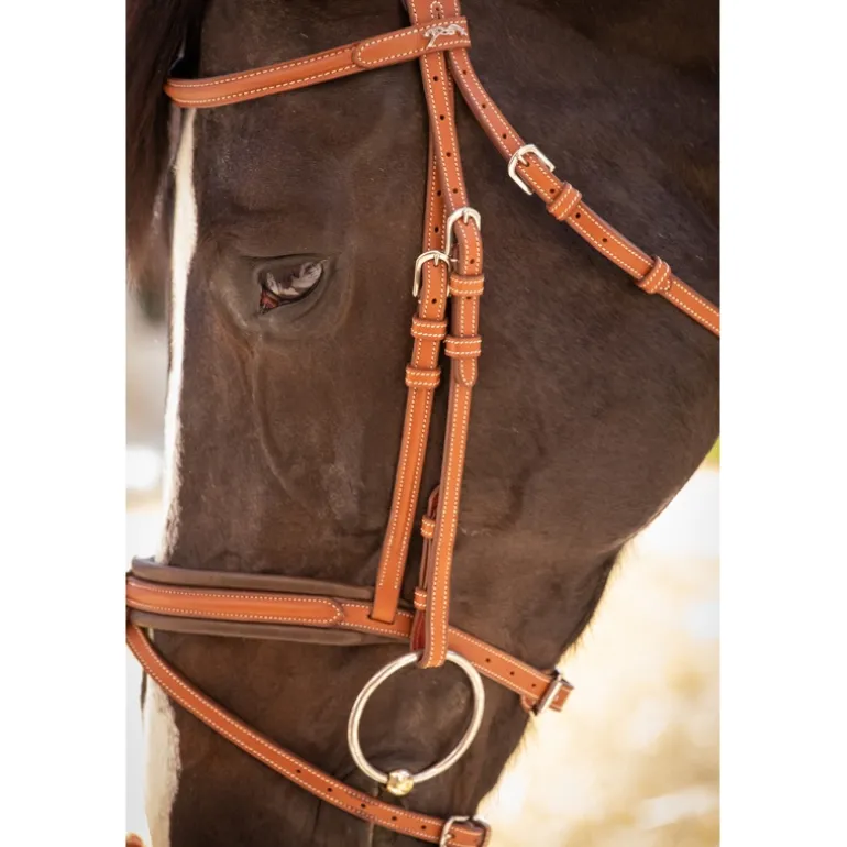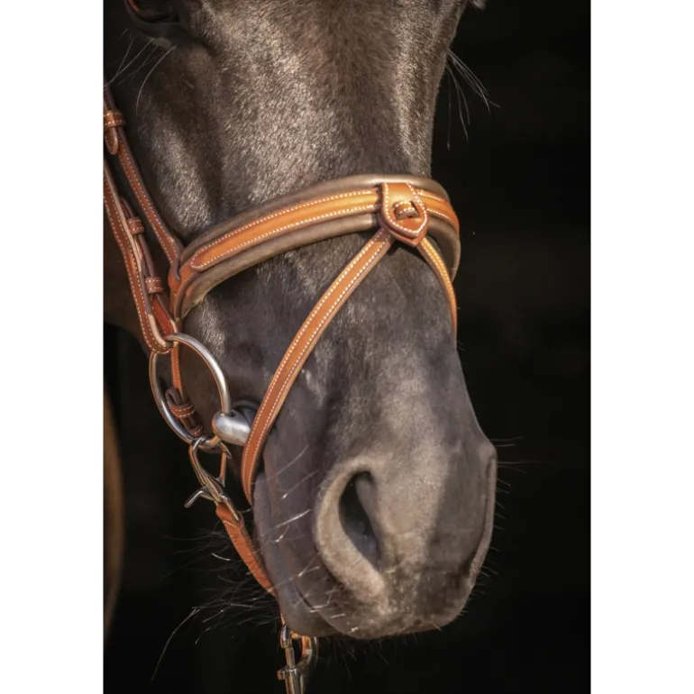 Bridon « Elégance » Pénélope orné de surpiqûres crèmes en contraste. Il est composé d’une muserolle large combinée doublée de cuir souple et d’une têtière anatomique elle aussi doublée de cuir souple sur la zone en contact avec la tête du cheval. Sur le dessus de la têtière se trouve un insert fin décoratif glissé dans des passants en cuir. Le pin’s Pénélope argenté est fixé à gauche sur le passant du frontal.