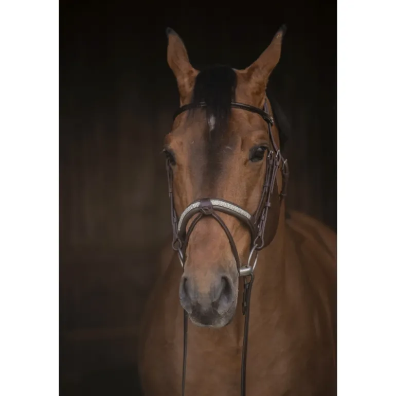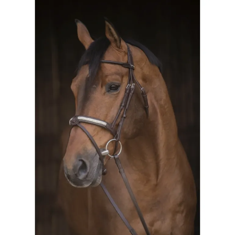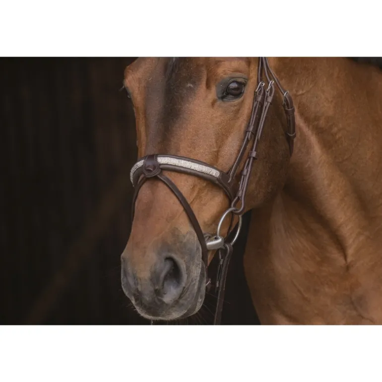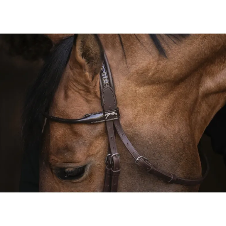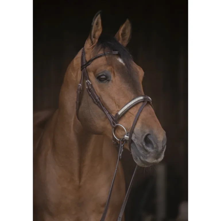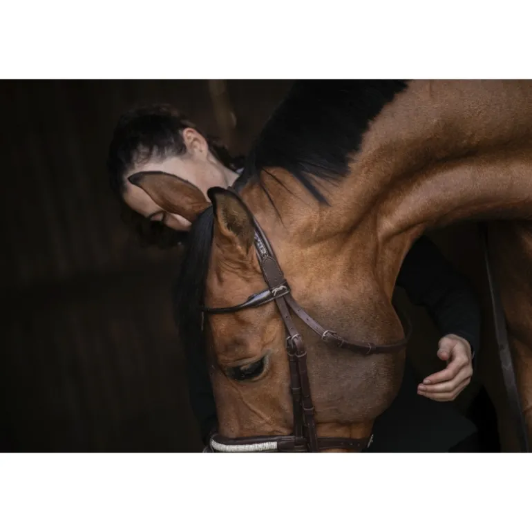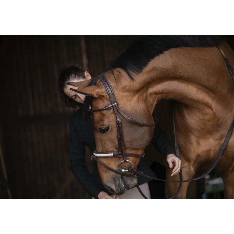 Magnifique bridon Symphonie en cuir composé d’une muserolle rehaussée de strass, d’un frontal rond verni et d’une têtière en point sellier verni. Sa muserolle combinée possède un noseband détachable si vous n’en avez pas l’utilité. Ce bridon, comme un bijou, est à utiliser les jour de concours hippiques avec la plus grande des délicatesses.
