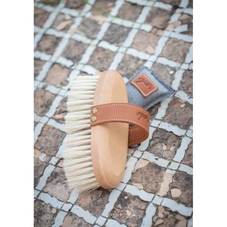Une très belle brosse qui va donner un maximum de style à votre sac de pansage. Cette brosse douce Pénélope est dotée d’une poignée en cuir pour une bonne prise en main et pour un pansage précis ! Ses poils très doux permettent de brosser les zones les plus sensibles de votre cheval. On retrouve le logo Pénélope embossé sur la poignée en cuir.