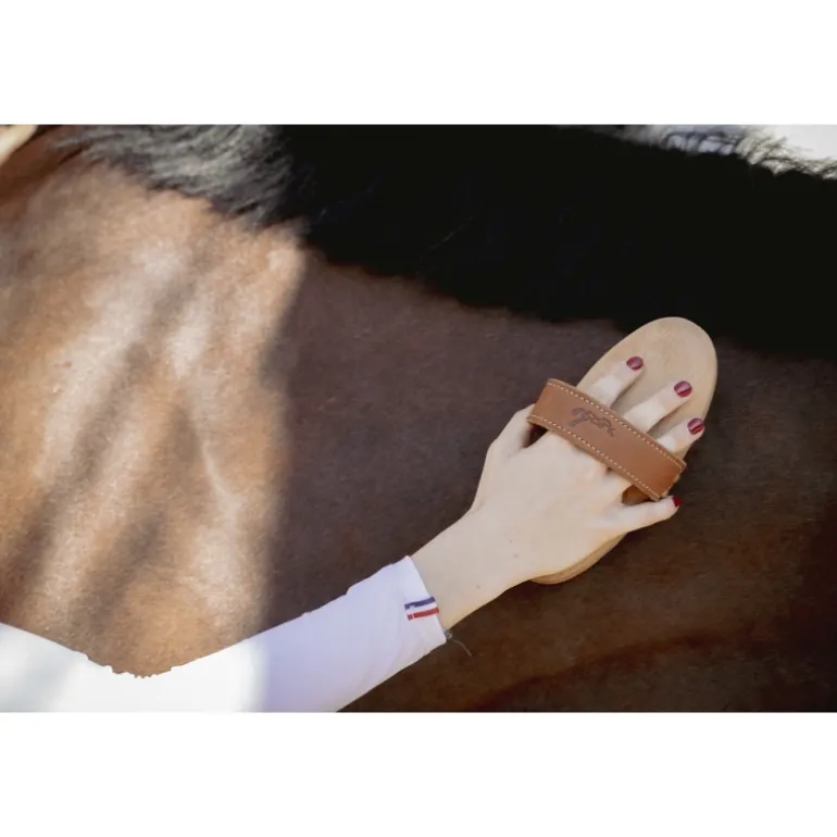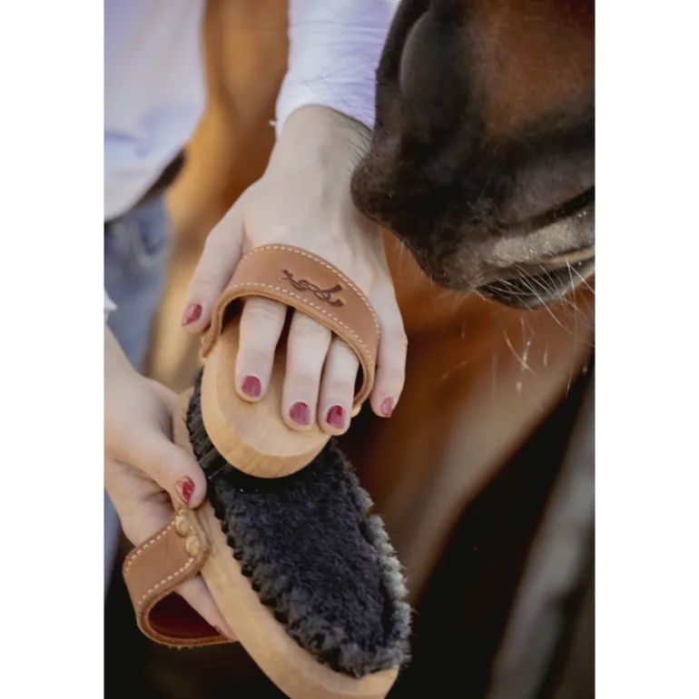 Brosse extra-douce composée de deux types de poils pour un brossage précis, doux et soigné. Sa forme ovale et sa poignée en cuir la rendent particulièrement pratique et assurent une bonne prise en main. Sur le dessous, au centre, des poils ultradoux permettent un brossage très soft. Tout autour, des poils courts et drus permettent de désincruster la saleté et assurent un bon pansage.