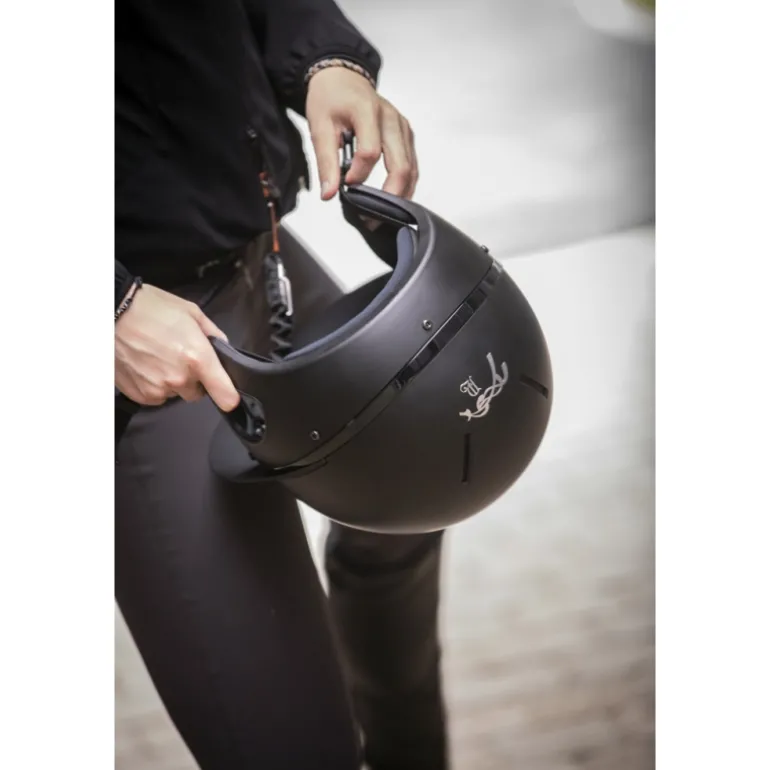 Ce casque au look épuré, disponible avec une visière courte ou longue est marqué à l’avant et à l’arrière du logo Pénélope en argent. Il répondra aux exigences des cavaliers soucieux d’utiliser un produit de grande qualité, fabriqué en France et qui apporte une vraie nouveauté autant en termes de sécurité que de look.