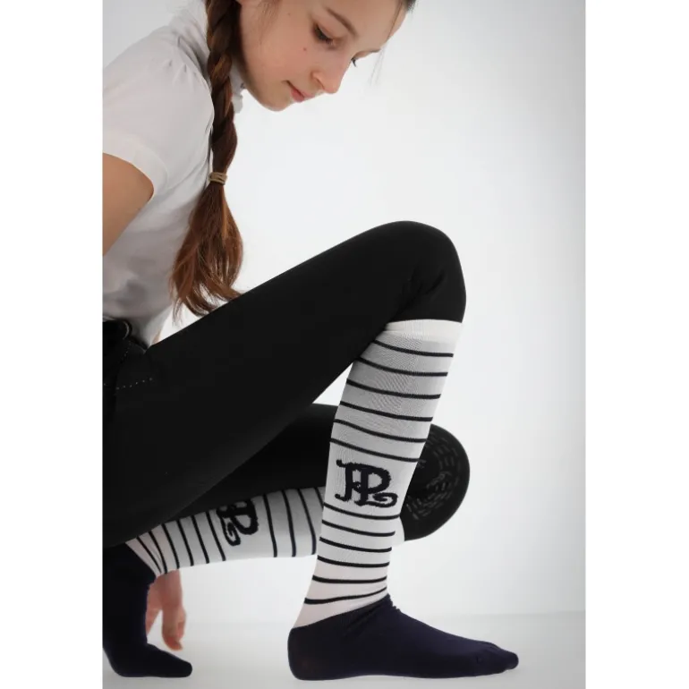 Chaussettes d’équitation d’inspiration marinière. Sur le mollet, elles sont marines et blanches et comportent également le monogramme PL. La zone du pied est marine unie. Elles sont très extensibles et donc confortables. Elles sont également très proches du mollet ce qui leur permet de bien se glisser sous les bottes d’équitation et sous les mini-chaps. En ville, elles apportent une touche d’originalité à vos looks équestres.
