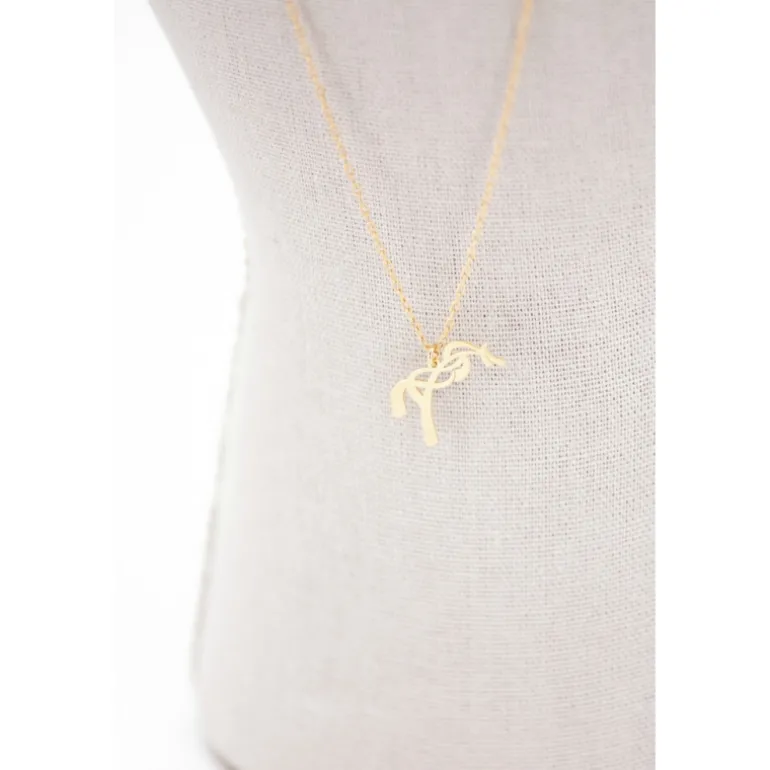 Collier doré composé d’une fine chaîne rehaussée d’un pendentif Pénélope. Il s’attache à l’arrière du cou et possède deux niveaux de réglage. À l’extrémité de la chaine, se trouve une petite breloque rectangulaire sur laquelle est gravée le monogramme PL.