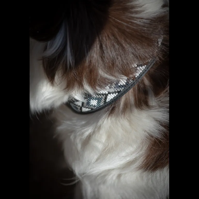 L’accessoire pour chien qui va rehausser avec délicatesse le look de votre compagnon à quatre pattes (et à poils plus ou moins longs) qui vous suit partout aux écuries. Le collier Pearl est composé de fines perles posées sur un beau cuir lisse. Il se ferme grâce à une boucle argentée où l’on peut y accrocher une laisse grâce à un anneau.