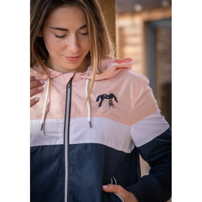 Après les coloris marine-caramel, bleu canard-gris et Prune, notre coupe-vent Celecce revient en 2022 en marine et rose pour embellir les journées de printemps pluvieuses. Le Celecce est confectionné dans un tissu léger et doux, très agréable à porter. Il s’associe parfaitement avec un jean ou avec un pantalon d’équitation. Il se porte un peu large car sa coupe n’est pas cintrée et il conviendra donc à de nombreuses morphologies. Il est doté d’une capuche bien enveloppante rehaussée d’un cordon blanc, de deux poches zippées et d’une fermeture éclair sur le devant. Son look tricolore en bloc est particulièrement dans l’air du temps. Le logo de la marque est brodé en bleu sur le cœur.