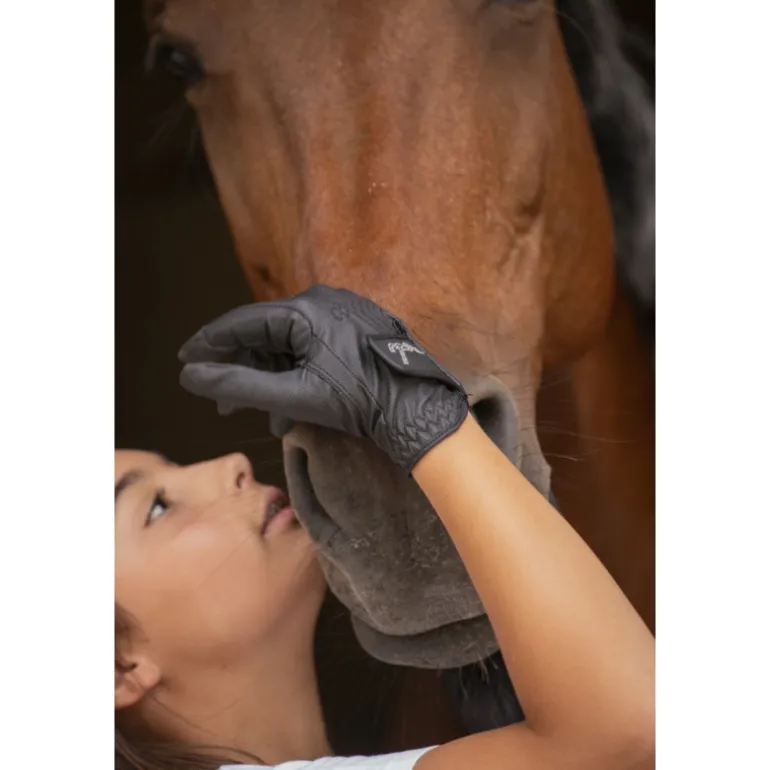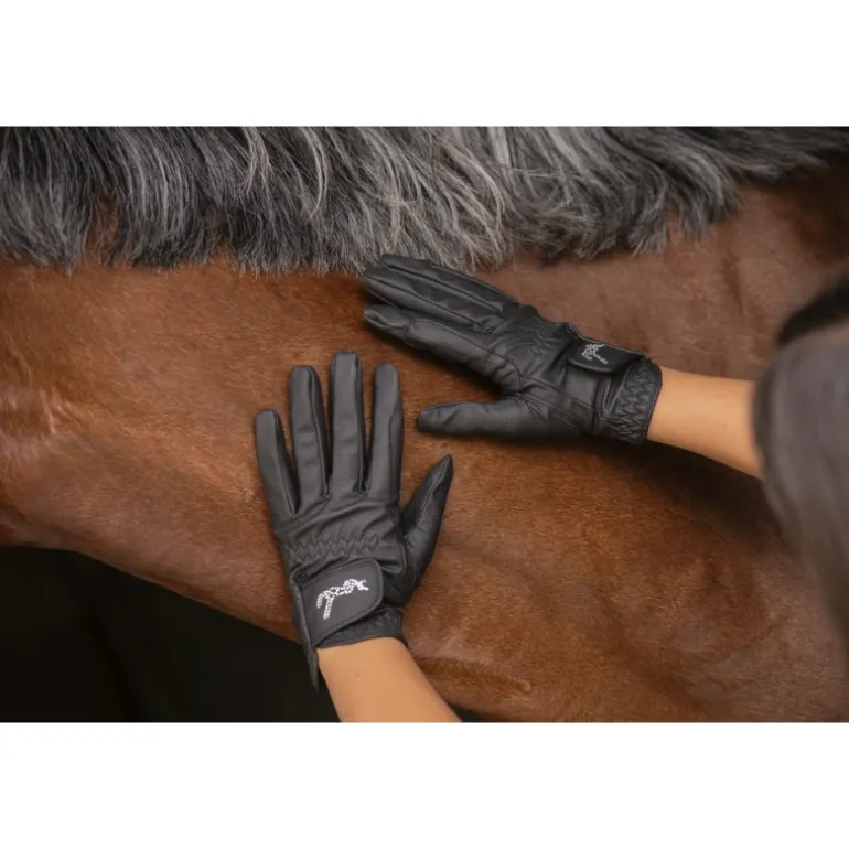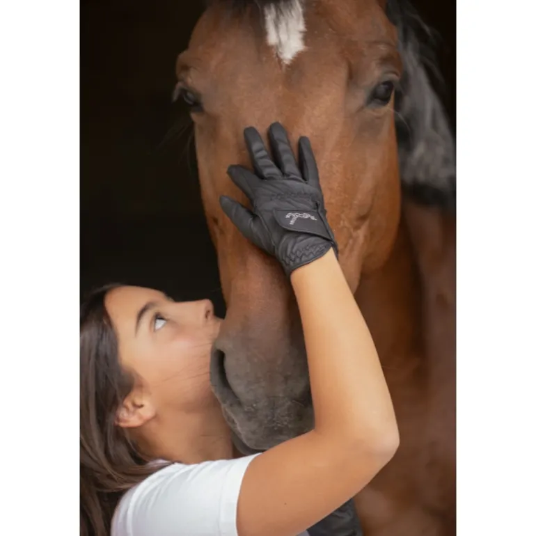 Girly les gants « Prisma » Pénélope collections ! Très confortables à porter tous les jours, ils sont fins, bien ajustés et permettent aux cavaliers de garder toute leur dextérité à cheval. La zone entre le pouce et l’index est renforcée pour une meilleure résistance dans le temps. Ils se ferment grâce à un velcro sur le dessus de la main et s’adaptent ainsi à plusieurs tailles de poignets. Sur ce velcro, on trouve le logo Pénélope en strass qui donne cette touche chic et discrète, 100% dans l’esprit Pénélope. Il peuvent s’utiliser à la fois quotidiennement aux écuries mais aussi en compétition.