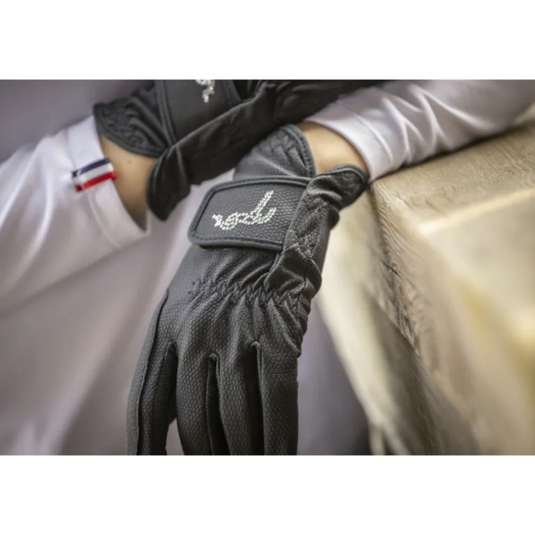 Chics et girly les gants « Prisma » Pénélope sont très confortables à porter tous les jours. Ils sont fins et bien ajustés et permettent aux cavaliers de garder toute leur dextérité à cheval. La zone entre le pouce et l’index est renforcée pour une meilleure résistance dans le temps. Ils se ferment grâce à un velcro sur le dessus de la main et s’adaptent ainsi à plusieurs tailles de poignets. Sur ce velcro, on trouve le logo Pénélope en strass qui donne cette touche chic et discrète, 100% dans l’esprit Pénélope. Ils peuvent s’utiliser à la fois quotidiennement aux écuries mais aussi en compétition.
