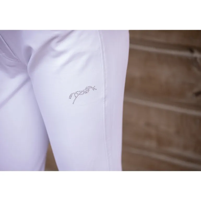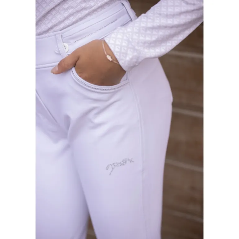 Le pantalon d’équitation Élégance blanc est doté d’un rang de strass sur la sur-ceinture et également le long des deux poches avant et arrière. Un petit cheval Pénélope, lui aussi en strass, est posé au milieu de la cuisse gauche. Ce pantalon d’un grand confort grâce à son tissu stretch, a des renforts anti-dérapants à l’intérieur des genoux et une taille légèrement haute, bien ajustée. Le bas de jambe est en lycra pour s’adapter à de nombreuses morphologies. C’est une très jolie pièce confortable à porter qui fera sensation sur les pistes de concours.