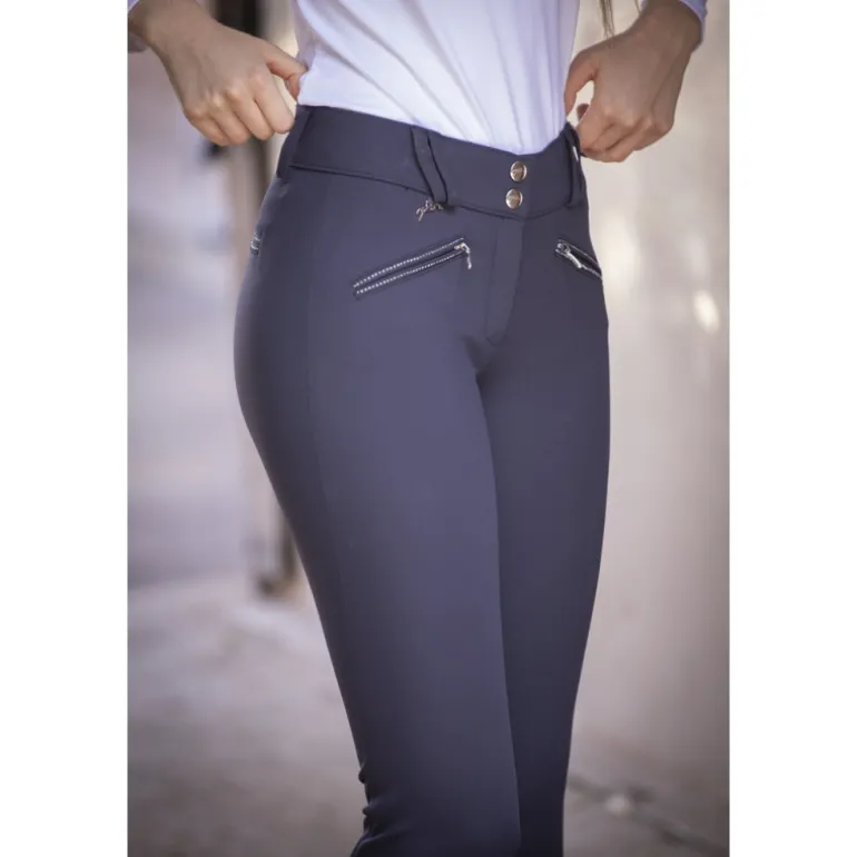 Pantalon d’Équitation Rocky Stone Pénélope. Un pantalon d’équitation confortable et technique pour tous les jours. Sa coupe près du corps et sa taille ni trop haute ni trop basse dessinent parfaitement la silhouette. Il a deux petites poches zippées sur le devant et deux fausses poches à l’arrière rehaussées par un rang de strass très discrets. Il est doté d’une ceinture assez large qui favorise un bon maintien à la taille. Il se ferme par deux petites pattes sur le devant et possède des passants de ceinture assez fins. À l’intérieur des genoux, se trouve une zone de grip pour bien fixer la jambe une fois en selle. Les bas de jambes sont faits en lycra pour s’adapter à toutes les morphologies et aux tailles de jambes différentes.