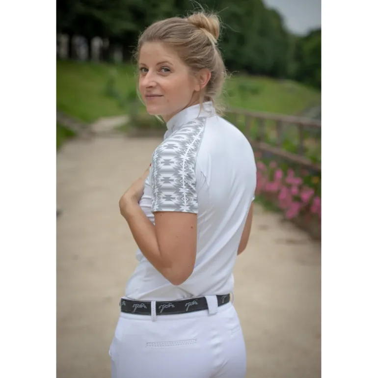 D’un confort absolu, notre polo de concours Anaïs se fait joliment remarqué grâce ses deux inserts aux motifs géométriques blanc et gris sur les épaules. Il est doté d’un col officier blanc pour pouvoir le porter en concours. Son tissu stretch offre une plus grande aisance et un confort maximal. Il se ferme par une rangée de boutons cachés par une jolie patte. Il peut s’associer avec un pantalon d’équitation blanc pour les concours.