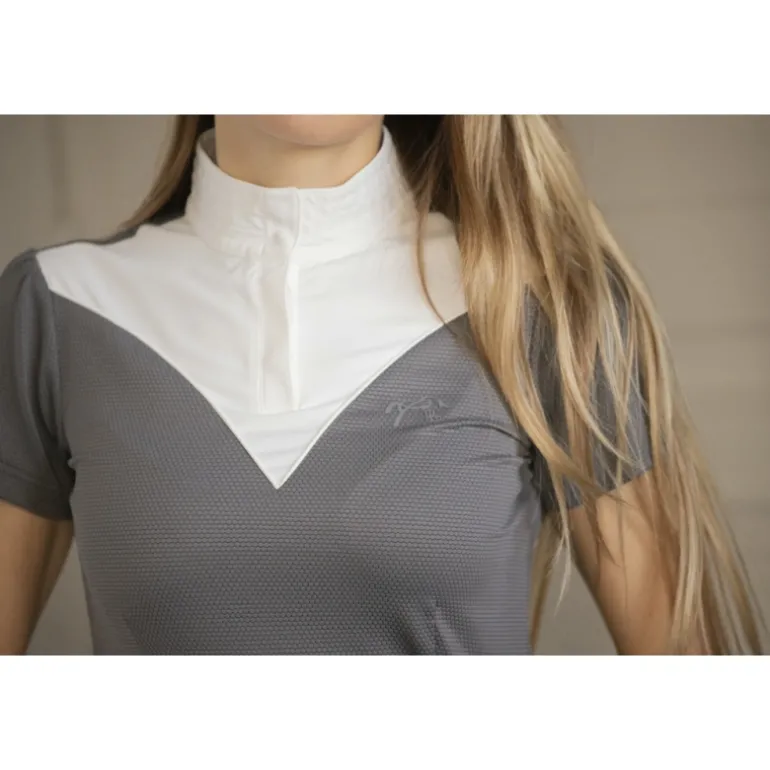 Polo de concours Las Honey manches courtes confectionné dans un tissu alvéolé léger et respirant. Avec son plastron joliment dessiné au dessus de la poitrine, il allie le chic et la technicité nécessaire à la pratique du concours hippique.