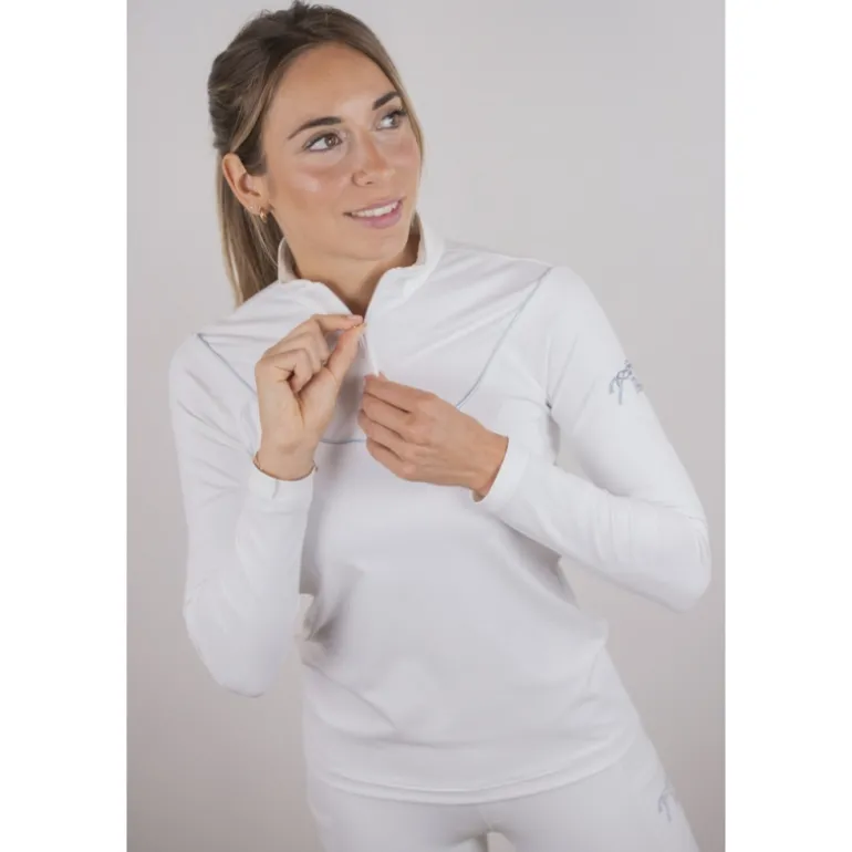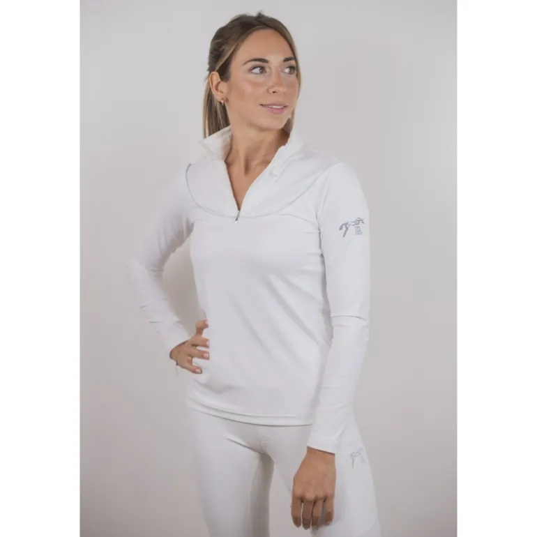 Le polo de concours Toscane à manches longues est composé d’un plastron arrondi sur le devant bordé d’un passepoil bleu ciel. Il est doté d’un joli col officier qui se ferme par un zip invisible. Le logo Pénélope apparait en strass bleu ciel sur le haut de la manche gauche pour une touche raffinée. Agréable à porter, il est confectionné dans une matière légère et très confortable. Son style, à la fois chic et sportswear fait de lui le polo parfait pour pratiquer la compétition équestre.