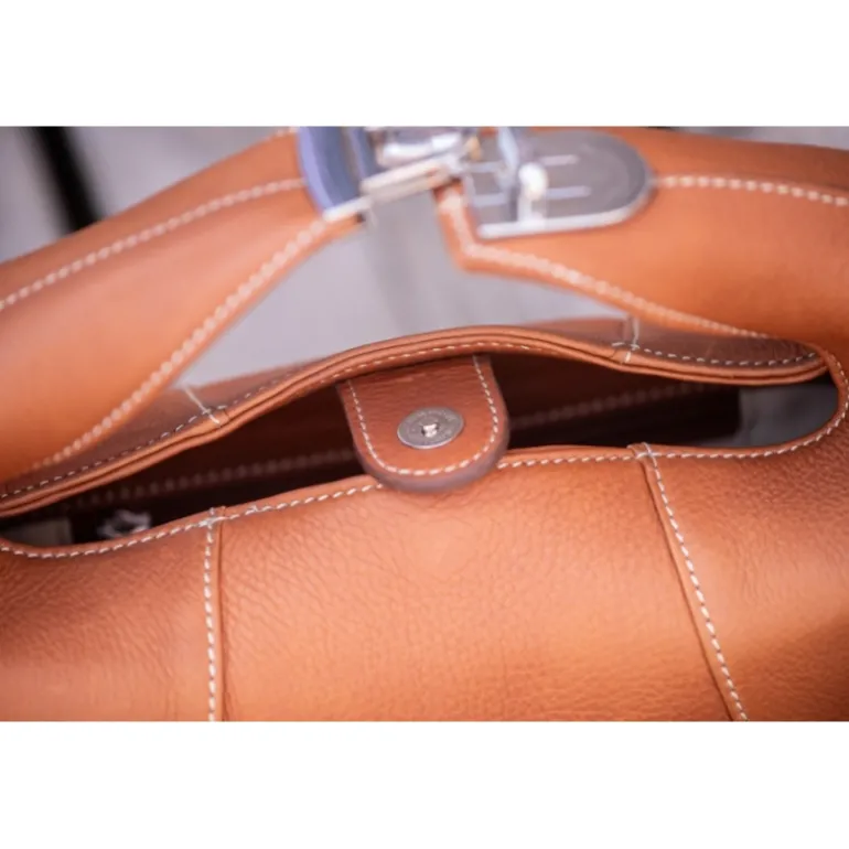Cet Adorable petit sac à main Agathe est doté d’une poignée originale avec une fermeture cartable appelée Tuck. Pour un porté à l’épaule ou en bandoulière, il possède une lanière large à motifs chevrons amovible et réglable. Il se ferme facilement grâce à une petite patte intérieure rehaussée d’une pression. Pour plus de praticité, une petite poche intérieure zippée permet le rangement de petits accessoires. Très chic, le sac Agathe est constitué de trois pièces de cuir grainé de couleur cognac cousues entre elles par un point sellier crème. Le logo Pénélope est embossé dans la pièce de cuir centrale.