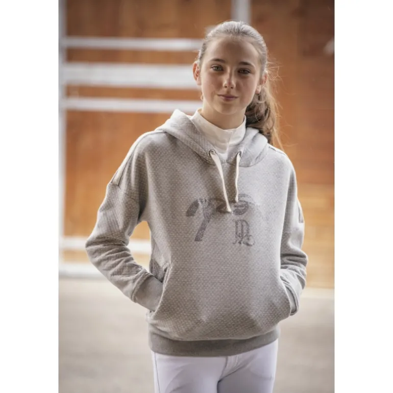 Sweat-shirt « Chilly » confectionné dans un tissu très doux à motifs plumetis. Il a une capuche dotée de cordons de serrage couleur crème et possède deux poches zippées très discrètes de chaque côté. Sur le devant, il a un marquage du logo Pénélope en glitter gris qui lui donne une touche « glamour chic« . Sur les épaules un galon gris, crème et argenté dessine joliment la silhouette.