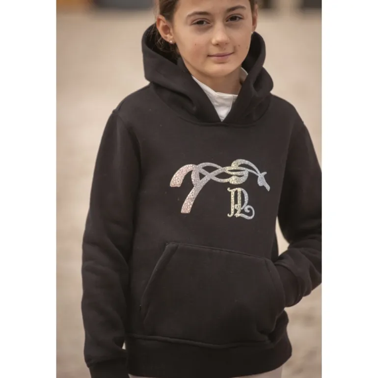 Sweat-shirt noir à capuche avec une poche centrale zippée et un marquage du logo Pénélope sur le devant dans une matière « croco rainbow«