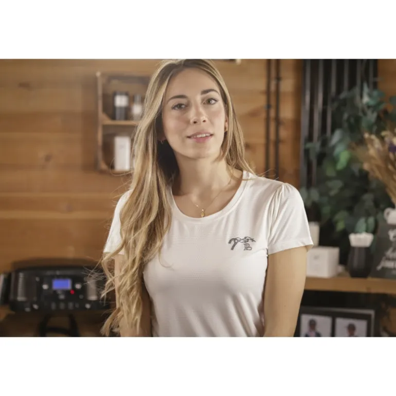 T-shirt « Techty » technique confectionné dans un tissu micro-aéré respirant et ultraléger, spécifiquement étudié pour la pratique des sports équestres ou autres sports. Il possède des manches courtes surmontées de petites fronces aux épaules. Il a un col rond joliment dessiné et un marquage du logo Pénélope en strass sur le cœur.