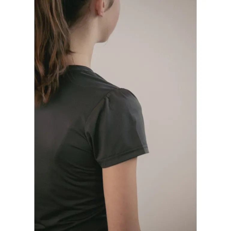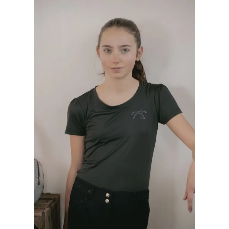 T-shirt « Techty » technique confectionné dans un tissu micro-aéré respirant et ultraléger, spécifiquement étudié pour la pratique des sports équestres ou autres sports. Il possède des manches courtes surmontées de petites fronces aux épaules. Il a un col rond joliment dessiné et un marquage du logo Pénélope en strass sur le cœur.