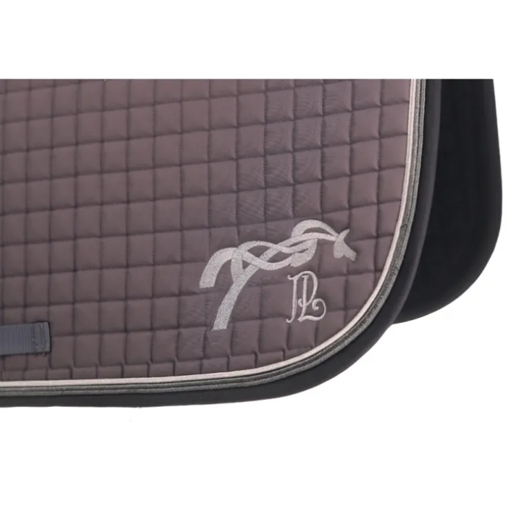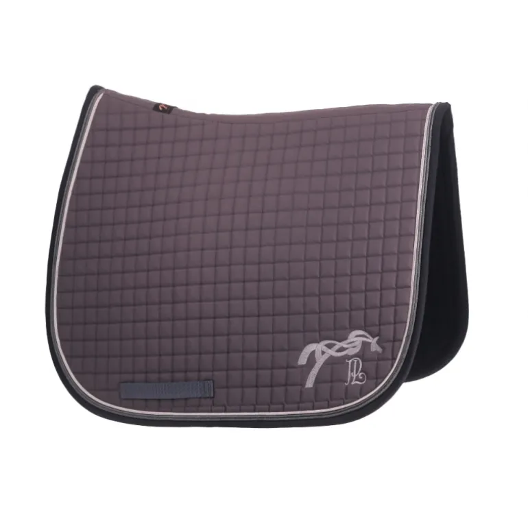 Ce magnifique tapis de selle américain en série limitée est reconnaissable grâce à son matelassage à carreaux plus fins que son voisin, le tapis de selle classique. Doublé de nid d’abeilles respirant et absorbant, il a une belle découpe de dos qui permet une pose et un dégarrottage facile. Il a également deux passants de sangle qui permettent que le tapis reste bien en place sous la selle. Il est décoré de jolis galons : un noir à l’extérieur et 2 brillants à l’intérieur. Le logo Pénélope est brodé à gauche.