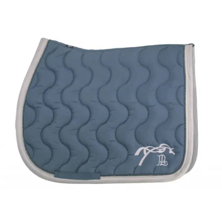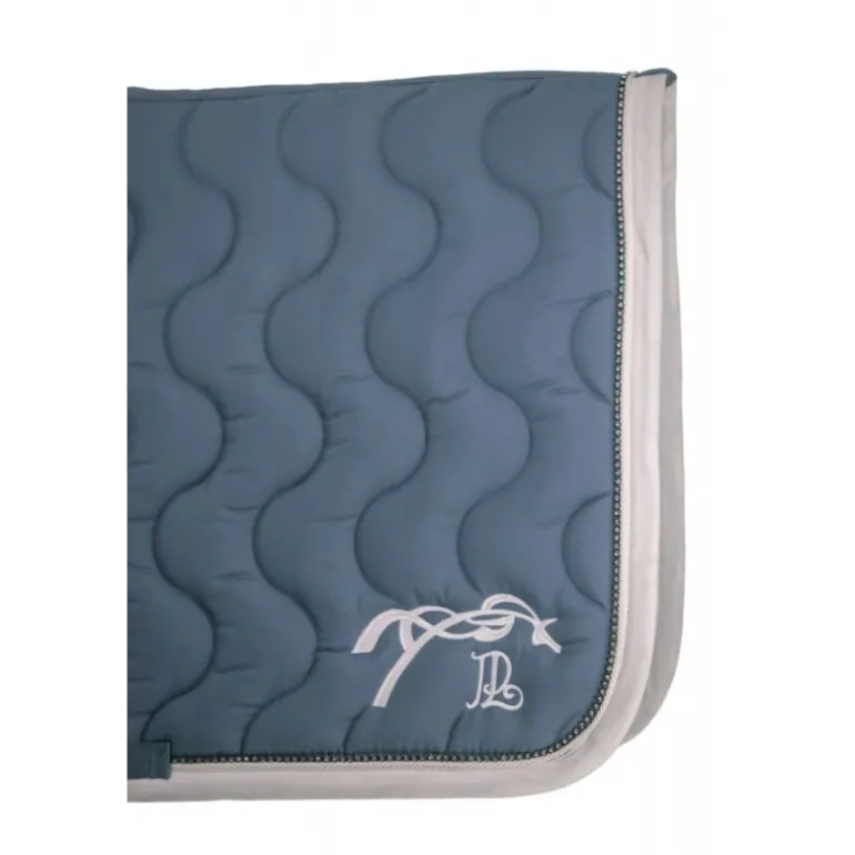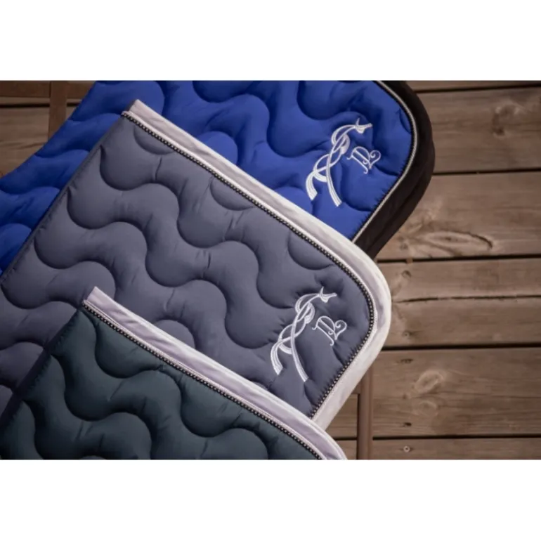 Le tapis de selle Diamant se distingue par son matelassage en vagues, son galon rehaussé d’une fine tresse et son contour délicatement orné de strass. Il a une belle ligne de dos bien dessinée pour faciliter le dégarrottage et un matelassage épais pour préserver le dos du cheval. Doublé en un tissu nid d’abeilles respirant qui absorbe la transpiration du cheval, il apporte un maximum de confort pendant le travail. Il possède également deux passants de sangle de chaque côté pour assurer sa bonne fixité sous la selle. À l’arrière, une jolie broderie Pénélope se distingue des deux cotés.