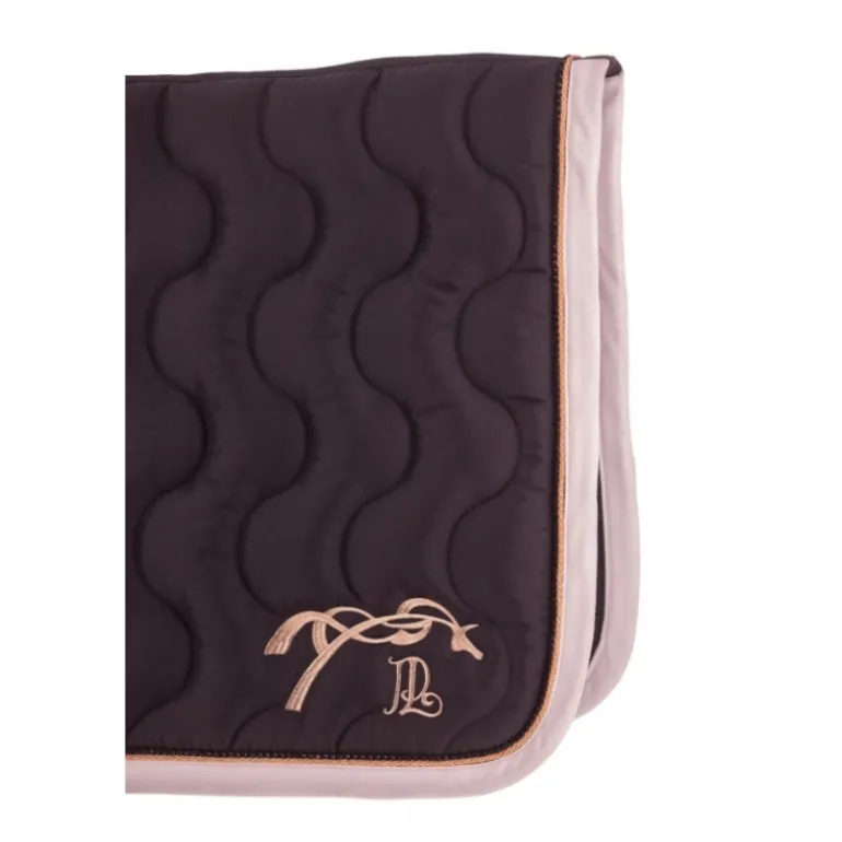 Le tapis de selle Diamant se distingue par son matelassage en vagues, son galon rehaussé d’une fine tresse et son contour délicatement orné de strass. Il a une belle ligne de dos bien dessinée pour faciliter le dégarrottage et un matelassage épais pour préserver le dos du cheval. Doublé en un tissu nid d’abeilles respirant qui absorbe la transpiration du cheval, il apporte un maximum de confort pendant le travail. Il possède également deux passants de sangle de chaque côté pour assurer sa bonne fixité sous la selle. À l’arrière, une jolie broderie Pénélope se distingue des deux cotés.
