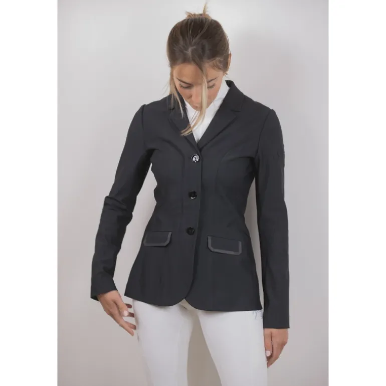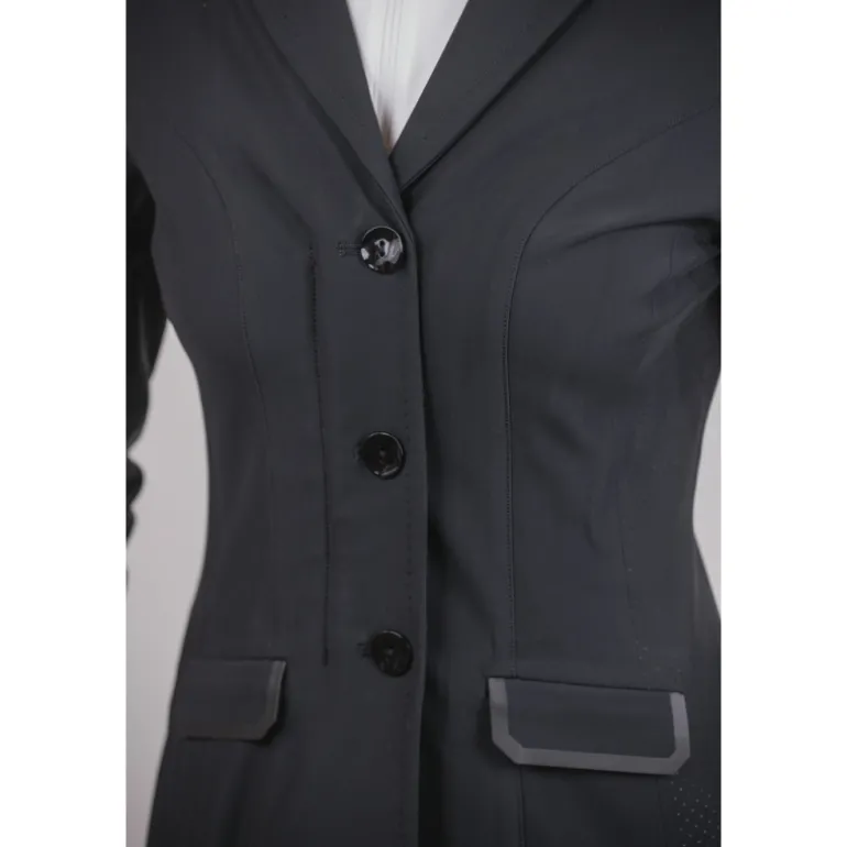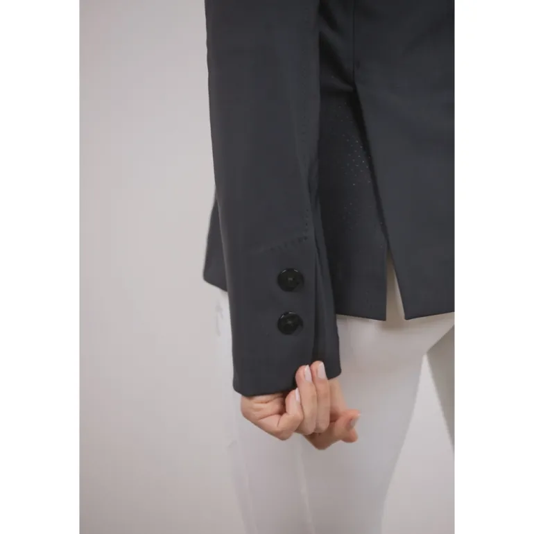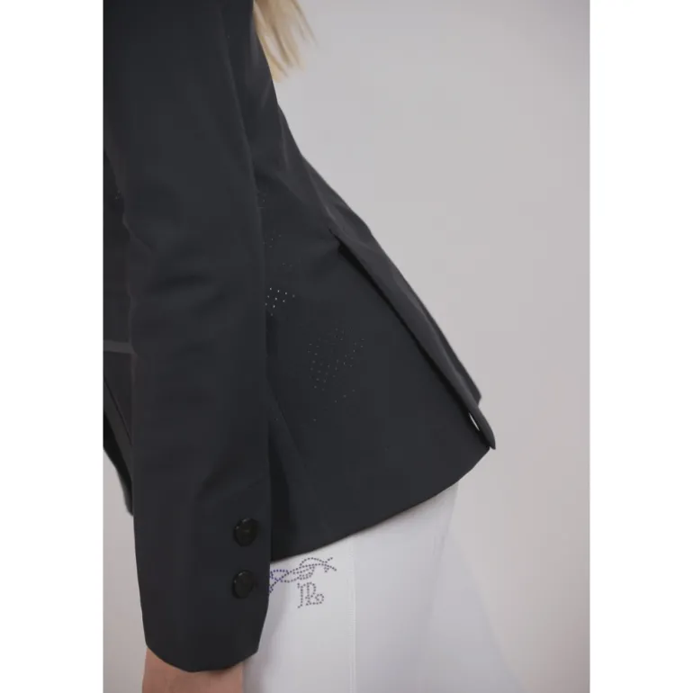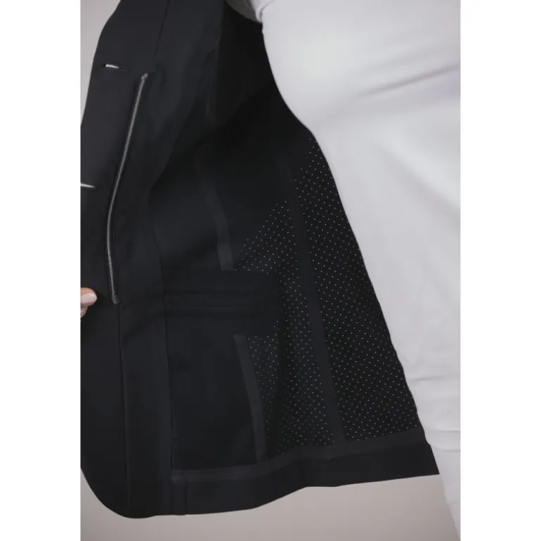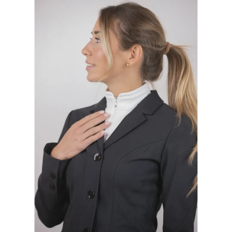 Confectionnée dans une matière ultra stretch, une partie de la veste est ajourée pour permettre un maximum de confort et de respiration. Elle est composée d’un zip sur le devant complété par un rabat sur lequel se ferment trois boutons ton sur ton. Sur le devant, il y a deux fausses poches surmontées d’un galon plat légèrement brillant. Elle est particulièrement cintrée et féminine et s’ajuste à de nombreuses morphologie. Confortable, elle est parfaite pour participer à des compétitions équestres avec beaucoup d’élégance.